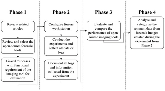 Researchers [6,7,9] use a mix of commercial and free tools (e.g., EnCase, FTK Imager, and SANS SIFT Workstation) in their studies based on a trust relationship with suppliers, and these tools are often compared and evaluated based on the Computer Forensics Tool Testing Program (CFTT) (the CFTT is a computer forensic tool testing framework developed by the NIST of the United States of America (USA) to evaluate the functionalities of any forensic tool [10,11]) framework. The functionalities or requirements for forensic tools mentioned in CFTT include the following: a forensic tool should be able to perform such functions as obtaining a digital source using a suitable interface (e.g., universal serial bus (USB), and firewire), notifying a user about the type of error from the source, generating a different type of log to fully audit results, etc. The previous research [12,13,14] used various functions required from NIST’s CFTT framework to evaluate different forensic imaging tools. However, no researcher exhausted all the functional requirements mentioned in the NIST framework to evaluate different open-source forensic imaging tools. In addition, we note that no researchers had compared the hardware usage and time consumption of each forensic imaging tool.