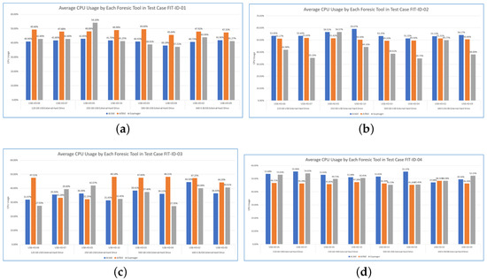 Average CPU consumption for each forensic tools in different test case. (a) FIT-ID-01. (b) FIT-ID-02. (c) FIT-ID-03. (d) FIT-ID-04.