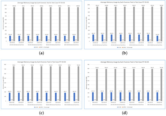 Average Memory consumption for each forensic tools in different test case. (a) FIT-ID-01. (b) FIT-ID-02. (c) FIT-ID-03. (d) FIT-ID-04.