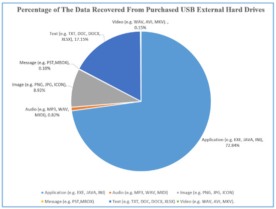 Table 6 presents the purchased hard drives that we used to collect remnant data along with various types of data recovered from respective hard drives. In this research, different types of file format were categorised into six main categories as follows: application (e.g., EXE, JAVA, INI, C, F, and H), audio (e.g., MP3, WAV, and MIDI), image (e.g., PNG, JPG, and ICON), message (e.g., PST, and MBOX), text (e.g., TXT, DOC, DOCX, and XLSX), and video (e.g., WAV, AVI, and MKV). The purchased hard drives were divided into four categories, i.e., small, medium, large, and extra-large; in addition, the drive IDs along with their exact size (in gigabytes) are presented in this table. Complete information about the experimented USB hard drives is presented in Appendix C https://github.com/imdadullahunsw/forensics, accessed on 7 June 2022), specifically, hard drive ID, source device, source hashes with write blocker, and source hashes without write blocker. After recovering data from the small storage USB hard drives, many data types were found, such as videos (e.g., movies, TV series, music, and videos), photos (e.g., family and wedding photos, car number plate, and contract payment), several personal documents (e.g., CV, and driving license) and organisation information (e.g., advertising documents and business contracts), and some sensitive information (e.g., bank information, and bank transaction records).