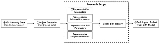 In this study, the rails, ballast, and sleepers of ballasted track were selected as research subjects. The combined processes of object detection and scan-to-BIM, illustrated in Figure 1, were researched assuming that the maintenance of railroad facilities have been automated. It consists of five steps: (1) collection of point cloud data through 3D scanning; (2) point cloud-based object detection; (3) 3D scan data review using representative parameters for rails, ballast, and sleepers during object detection; (4) linking of railroad BIM library elements corresponding to rails, ballast, and sleepers, based on the object detection results; and (5) construction of a railroad BIM for maintenance. The scope of the current study encompassed two of these steps, i.e., (3) 3D scan data review using representative parameters for rails, ballast, and sleepers during object detection and (4) linking of railroad BIM library elements corresponding to rails, ballast, and sleepers based on the object detection results.