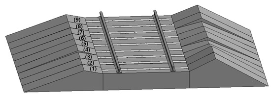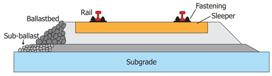 Generally, a ballasted track is referred to as “classical track” or “conventional track” and has been in use longer than concrete track [24]. The term “ballasted track” is used in the International Union of Railways (UIC) Leaflet 719 [25]. The core structure of this ballasted track is composed of rails, fastenings, sleepers, the ballast bed, sub-ballast, and subgrade [24], as shown in Figure 3.