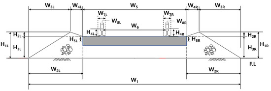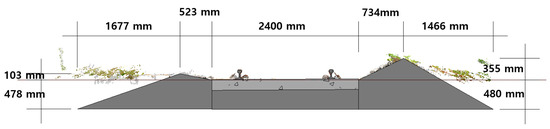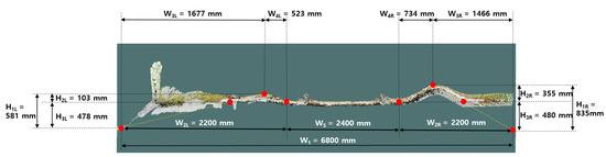 Third, considering the representative parameters for the reduction of ballast shoulder width damage type in the ballast refill, the same values of W2R = W2L = 2200 mm were obtained for the right and left ballast shoulders for sleeper (1) of the testbed. However, the measurements for W3R and W3L were different from each other, as were the measurements for W4R and W4L, confirming the occurrence of damage associated with reduction of the ballast shoulder width (Figure 12).