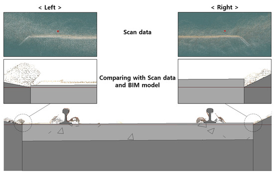 With recent developments in digital technology, including research on reverse engineering (RE), studies on constructing building information models (BIM) by acquiring as-built structure shape information through three-dimensional (3D) scanning [1]. RE is a technology used to generate drawings of old buildings for which no drawings are available [2] or to acquire shape information about objects and extract 3D models and two-dimensional (2Dloe) drawings using photogrammetry and light detection and ranging (LiDAR) techniques for reviewing the construction of structures [3]. RE using a 3D laser scanner is faster than the conventional method and has the advantage of acquiring information in a noncontact manner [4]. These features make RE suitable for railroad facilities that have no drawings because they were installed a long time ago or those requiring rapid maintenance. Similar to other types of Social Overhead Capital (SOC) facilities, railroad facilities require timely maintenance. They are complex facilities concentrated in small spaces, with components such as rails, sleepers, ballast, and railway catenary system, and the requirement that trains be operated at specified times. Effective maintenance of railroad facilities is considered critical because it is closely related to the incidence of accidents. In particular, the loss of ballast creates voids around the sleeper on a ballasted track. This, in turn, causes the sleeper to be supported improperly. This phenomenon affects train safety and thereby, emphasizes the importance of maintaining railway facility [5,6].