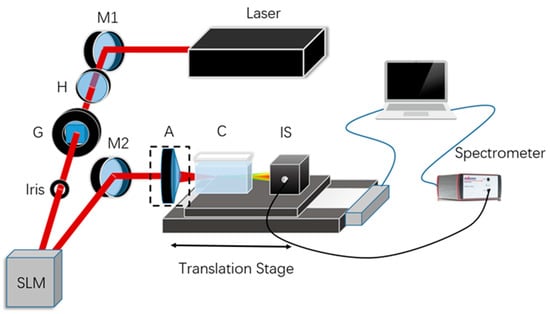 To explore the characteristics of the SC induced by filamentation of BG and LG beams at different locations in water, we design an experimental setup shown in Figure 1. The laser pulses are generated by an amplified Ti: Sapphire laser system. The central wavelength, duration and repetition rate of the laser pulses are 800 nm, 50 fs and 1 kHz, respectively. The maximum pulse energy is 3.0 mJ, and the pulse energy is adjusted by an energy attenuator composed of a half-wave plate H and a Glan prism G to the desired value. The beam spot size is adjusted by an iris (which is 10 mm in the experiment), and consequently, the light beam can perfectly enter the liquid crystal screen of a spatial light modulator (SLM, Hamamatsu LCOS-SLM, X13138). The SLM can generate LG beams by loading the phase diagram (see Figure 2a′–c′ in Ref. []). In this experiment, we attempt to compare the characteristics of the SC generated by higher-order BG and LG beams, and thus two kinds of optical lenses are used to focus the vortex beams: One is a focusing (plano-convex) lens (fused silica), whose focal length is f = 75 mm, and the other one is an axicon lens, whose top angle is 170 degrees. As the generated LG beams with different TC values pass through the axicon lens, higher-order BG beams can be generated. The dashed rectangle suggests the axicon lens can be replaced by a focusing lens. The vortex beams are focused into a quartz cuvette C (with dimensions: 50 mm × 10 mm × 40 mm) filled with water and form filament generating the SC. The transmitted spectrum (i.e., the SC) is firstly collected by an integrating sphere IS and then guided to a spectrometer (Avantes, avaspec-uls2048l), and thus the transmitted spectral data are obtained. Both the cuvette and integrating sphere are fixed on an electric translation stage, and by moving the electric translation stage, the SC induced by femtosecond laser filamentation at different locations in water is recorded. This method is somewhat similar to the Z-scan technology [,,]. The propagation of laser beams in water is affected by the water attenuation and water-induced turbulence (e.g., bubble generation), which affect the stability of supercontinuum. To reduce the error, each spectrum is obtained by an average of a hundred measurements.