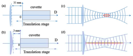 Definition of the ‘zero position’ in the experiment (i.e., D = 0 mm) in the case of using the (a) focusing and (b) axicon lenses. Schematic diagram for Gaussian beam which passes the (c) focusing and (d) axicon lenses. The red areas in (c,d) denote the focal region.