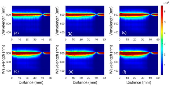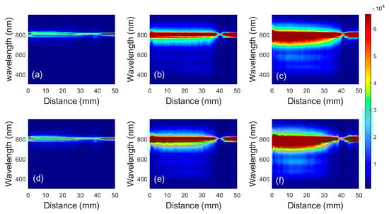 The laser pulse energy also affects SC generation. By changing the pulse energy (10, 52 and 104 μJ), we study the variation of the SC induced by filamentation of LG beams with D in the case of l = 0 and l = 2, as shown in Figure 5. It can be seen from Figure 5a,d that when the pulse energy is 10 μJ, the transmitted laser spectrum shows no obvious broadening, indicating that no filament is formed, for the SC generation is an obvious feature of femtosecond filamentation. It should be noted that due to the low pulse energy (10 μJ), the laser intensity in the focal region is relatively low, which is lower than the damage threshold of the cuvette wall, and thus little energy is absorbed or reflected by the cuvette wall. As a result, though the focal region of LG beams covers the cuvette wall at D = 40 mm, the transmitted spectrum changes little, which confirms the previous speculation of spectral ‘dip’. As the pulse energy is 52 and 104 μJ, filaments can be formed by LG beams, and the transmitted spectrum shows obvious broadening. Due to the high laser intensity in the focal region, as the cuvette wall overlaps with the focal region, it is ablated, part of the laser energy is absorbed or reflected, and thus the spatial distribution of transmitted spectrum shows a ‘dip’, as shown by Figure 5b,c,e,f. Figure 6 show the variation of the SC generated by LG beams with D when the value of TC is 0, 1, 2, 3, 4 and 5. For higher-order LG beams, the variation of the degree of spectral broadening with D is similar to that shown in Figure 6a (i.e., 0-order LG beam), which also exhibits plateau regions, as shown in Figure 6c–f. It can also be seen from the figure that along with the increase of TC value, the degree of spectral broadening changes little, i.e., it is not related to the TC value of LG beams, which is consistent with the work of Zhang et al. [].