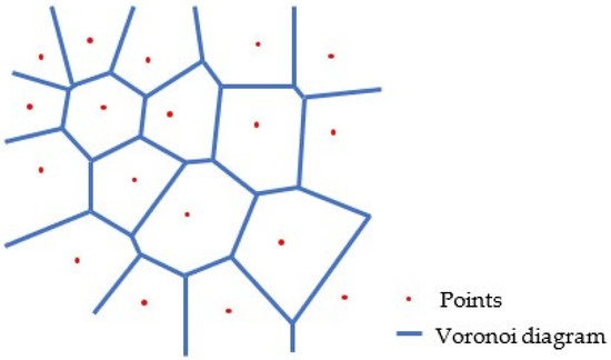 An example of a Voronoi diagram is illustrated in Figure 1. It can be seen that the distance between points is computed by Euclidean distance in the planar Voronoi diagram.