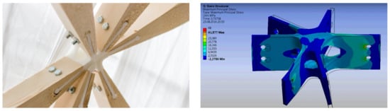 Finally, the stresses and utilisation in the node can be visualised similarly to the displacements, as shown in Figure 14. Here, the stresses are illustrated. Moreover, the user can select utilisation based on Von Mises, , , , , and . As for the displacements, the numerical values can be extracted as lists with indices corresponding to the ID of each node and element. With the given load case from Table 1, two of the incoming members have significantly greater forces than the remaining four. This can be seen in the stress plots as well, with the colour intensity being greatest in two of the six arms. As the colour map of the stresses illustrates, the different types of nodes have high stress concentrations in different areas of the node as well. For the Glued Finger node in Figure 14a, the short distance between the timber part and the node’s centre gives relatively uniform compression stresses close to the centre compared to Starnode in Figure 14c, which has more significant stress closer to the beams. In the Polo-1 node, Figure 14d, the arms of the nodes are “pushing” and “pulling” on the inner ring and deforming this. For the Mero ZK, Figure 10b, the local stresses where the bolts connect node and members were modelled. This results in significantly higher stresses in this area compared to the rest of the node, as shown in Figure 14b—indicating that the bolt dimension and metal thickness in this node are critical parts of the connection.