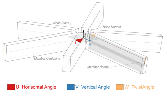 The geometry deviations between the members’- and the node’s plane can be described with three angles, often referred to as the U-, V-, and W-angles [14]. Figure 2 illustrates these three angles. The U-angle represents the horizontal angle, meaning the angle between two members in the node plane, the vertical angle, V, represents the vertical kink between the normal direction of two nodes at each end of a member, and the twist angle, W, represents the twist between the same normal directions. In general, the nodes need high precision in manufacturing to accommodate these angles.