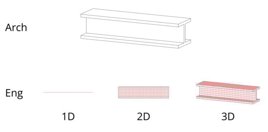 The architectural model of a beam represented as 1D, 2D, and 3D analytical elements.