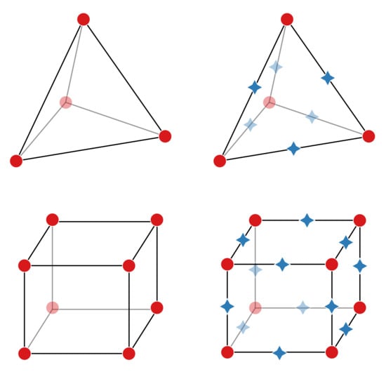 Currently available element types in the plugin. (Top): First and second order tetrahedron. (Bottom): First and second order hexahedron.
