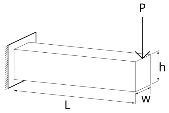 This subsection presents the plugin’s components through a practical example. The cantilevering beam in Figure 6 is analysed, and the performance of the available element types is evaluated and compared to the analytical solution as a benchmark. The beam has a length, L of 1200 mm, and a point load, P, of 150 kN is applied at the end. Further information about the cross section’s widh, w, and height, h, together with the Young’s modulus, E, yield stress, , and Poisson’s ratio, , are provided in Table 1.
