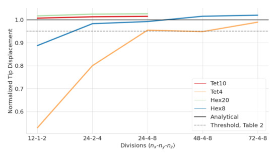 where is the second moment of inertia for a rectangular cross section. Inserting the relevant values into (1) results in a maximum deflection of mm and maximum stress of 270 MPa. Below, Table 2 presents the the elements’ normalised displacements and bending stresses, with respect to the analytical values, for the minimum number of elements, , where the accuracy is at least 95% of the analytical solution.