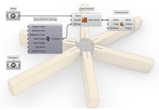 Figure 11 illustrates the architectural model of geometries provided by the architect, one brep (boundary representation) representing the node and six breps for the members, together with the meshing of the node. Here, the Tetrino plugin discussed in Section 2.3 is used to create a mesh of tetrahedrons from the brep after an initial surface meshing of the brep with the Quad Remesh component.