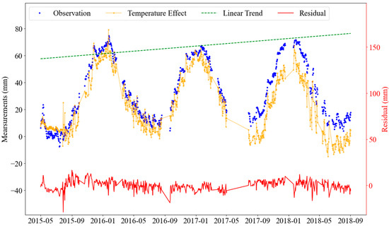 Taking the girder displacement 21 (G-D21) in Figure 2 as an example, a monitoring sequence can be decomposed into a linear trend, temperature effect, and residual, according to the multilinear regression model. During the whole period of analysis, the girder at G-D21 moves to one side at an average speed of 0.0154 mm/day. The displacement variations of the observation are consistent with the one caused by the temperature effect, which indicates that the temperature is a key factor for the displacement variation at G-D21.