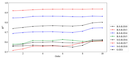 The monitoring data of the track system are discontinuous, so the autocorrelation, partial autocorrelation, Akaike’s information criteria, and Bayesian information criteria are no longer suitable for selecting the order of difference equation. The coefficient of R2 is adopted as the selection standard of model order and should satisfy the following two conditions: (1) the variation of R2 with the model order is stable; (2) the t-stat of each coefficient is greater than 1.96 (with 95% significance level). When the R2 of the model is greater than 0.7, the first order of R2 > 0.7 is selected. Since the monitoring data of the track system were averaged, the remnant effects of early measurements are relatively small. The lowest order of the model should be selected once the above conditions are achieved. Figure 3 presents the relationship between R2 and the order of the difference equation model. The model order of each measuring point is selected as 3, 1, 1, 3, 1, 1, 1, 1. The parameter estimation results of the time series difference equation models are shown in Table 3.
