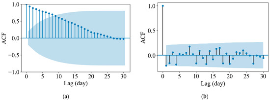 Serial dependence in the regression residuals and difference equation residuals is evaluated by analyzing the corresponding autocorrelation functions (ACFs). The longest continuous segment (97 days) of the monitoring sequence is selected to verify the feasibility of the aforementioned method for capturing the serial dependence. Figure 4 shows the ACFs of the regression residuals and difference equation residuals for R-S-R-D13. In terms of a stationary and serially-independent time series, the values of ACF are small, with lag ≥ 1, and vary irregularly with lags. By comparison, the time series difference equation model effectively eliminates the autocorrelation in the monitoring data. In addition, the ACF values of the difference equation residuals fall mostly in the blue shaded area in Figure 4b. The blue shaded area represents the 95% confidence interval. Therefore, the existence of serial dependence in the difference equation residual is rejected with 95% confidence.