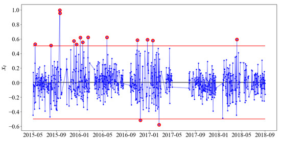 Figure 5 and Figure 6 show the individual control chart and moving range control chart for R-S-R-D13, where sixteen and twenty-two outliers are detected, respectively. For a stationary normal independent and identical distribution process, the individual control chart is expected to produce three outliers for each measuring point, and the moving range control chart is expected to produce eight outliers [24]. More detected outliers suggest the presence of special causes.