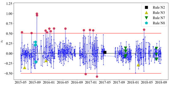 Rule N1 is the basic rule of the individual control chart to trigger the outliers. Rules N2–N8 are considered the supplementary detection of special events. Rules N2 and N3 are designed to detect sustained shifts and drifts in the means of monitoring sequences, respectively. Rule N4 is designed to detect the abnormal periodic changes of monitoring sequences. Rules N5–N8 are designed to detect sustained shifts in the variances of monitoring sequences.