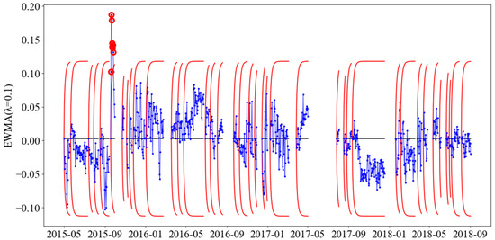 The adjustable parameter of EWMA control charts can be customized in the range . The smaller the is, the smoother the corresponding control chart. That is, more attention is paid to the sustained changes of the mean instead of outliers [24]. According to the characteristics of the required control chart and the discontinuous monitoring data of the track system, λ = 0.1 is selected. From the EWMA control chart with λ = 0.1 for R-S-R-D13 shown in Figure 8, it is noted that a small continuous shift from 19 September 2015 to 26 September 2015 is detected.