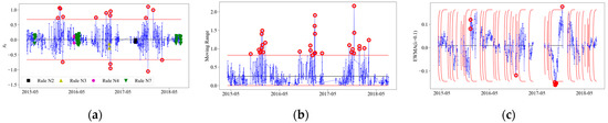 Control charts: S-G-R-D18. (a) Individual control chart; (b) moving range control chart; (c) EWMA control chart. Black line is the centerline. Red lines are the control limits. Red circles indicate the values beyond the control limits.