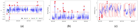 Control charts: R-S-R-D14. (a) Individual control chart; (b) moving range control chart; (c) EWMA control chart. Black line is the centerline. Red lines are the control limits. Red circles indicate the values beyond the control limits.