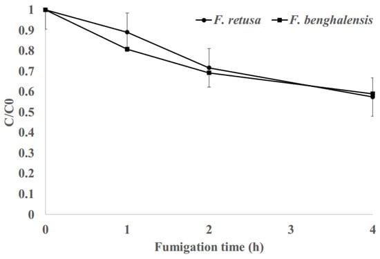 Concentration loss of ethyl formate (EF) (C/C0) in 0.275 m3 fumigation chamber with 5% loading ratio (w/v) of potted imported rubber plants (Fiscus retusa and F. benghalensis). EF was treated at 35 g/m3 for 4 h at 15 °C C = EF concentration determined at one of the time intervals and C0 = EF concentration at 0.1 h. EF concentration was determined at 0.1, 1.0, 2.0, and 4.0 h after EF had been applied to the fumigation chamber.