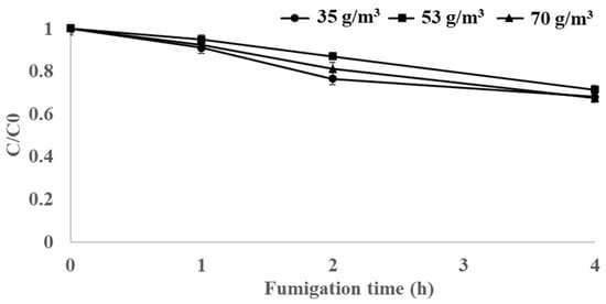 Concentration loss of ethyl formate (EF) (C/C0) in 6.8 L glass fumigation chamber with 70% loading ratio (w/v) of imported marble. EF was treated at 35, 53, and 70 g/m3 for 4 h at 15 °C C = EF concentration determined at one of the time intervals and C0 = EF concentration at 0.1 h. EF concentration was determined at 0.1, 1.0, 2.0, and 4.0 h after EF had been applied to the fumigation chamber.