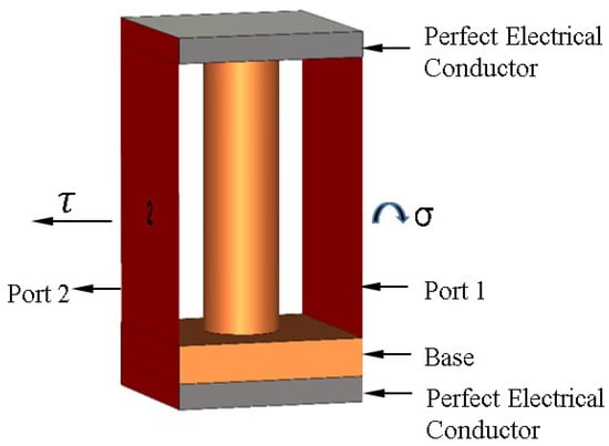 The two-port network as shown in Figure 1 is analyzed to figure out the overall antenna prototype. The cylinder of defined radius, r, which varies from 0.5 mm to 3.5 mm is supported by the base of 7.5 mm × 7.5 mm × 1.5 mm. The length and breadth of the base is slightly less than (/3), whereas thickness (0.06) is comparatively thin. Two parallel plates are kept above and bellow this structure so we have considered the perfect electrical conductor metal plate above and bellow the cylindrical unit cell whose dimension is 7.5 mm × 7.5 mm × 1 mm. The designed frequency of 12 GHz ( = 25 mm) is considered. The reflection coefficient is denoted by sigma (), whereas the transmission coefficient is indicated by tau (). The different permittivity values are generated by using one material that is based on the radius of cylindrical rods. The change in relative radius of these cylindrical rods generates respective transmission and reflection coefficient values, which are used to find permittivity. A calculation or a library from Computer Simulation Technology (CST) software were used where one simply finds the relativity permittivity.