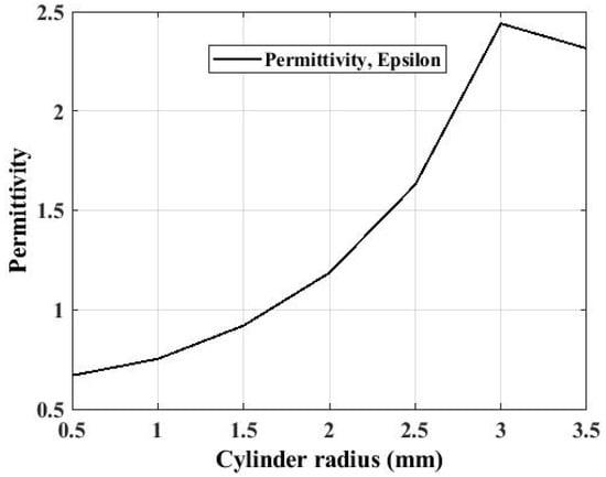 The successive change in the radius of cylinder determines the corresponding value of relative permittivity whose value extends from a minimum of 0.6687 to maximum of 2.4395. Figure 2 depicts the value of obtained relative permittivity, which highlights the fact that a decrease in radius of the cylinder corresponds to a decreased relative permittivity whereas an increase in its radius shows increased permittivity. The dimension of the cylindrical unit cell varies as 0.5, 1, 1.5, 2, 2.5, 3 and 3.5 mm in radius while height is kept constant at 11 mm (0.44). The choice of a particular cylindrical unit cell depends on the required permittivity values of seven different circular rings, which is based on the Luneburg lens principle. The relative permittivity () can be calculated as [],