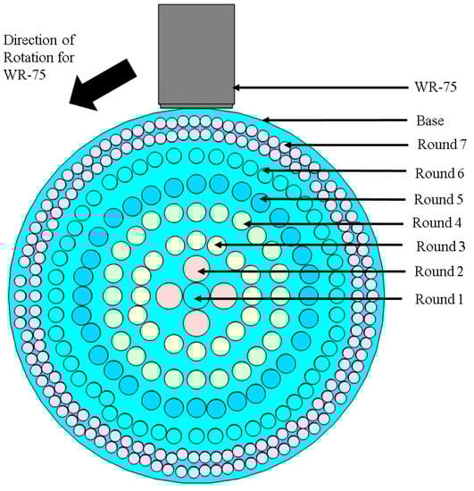 As described previously in Section 3.1, the respective cylindrical rods are placed for defined circular rings. In total, there are seven different rounds which are indicated by seven different colors as Round 1, Round 2, Round 4, Round 5, Round 6 and Round 7, where the cylindrical rods have the permittivity values varying as of 1.99, 1.95, 1.86, 1.72, 1.54, 1.32 and 1.05, respectively. This extends from the center towards the edge where the diameter of cylindrical rods is greater within the center region where as its radius gets decreased toward the edge. For seven different rounds of Round 1, Round 2, Round 4, Round 5, Round 6 and Round 7 the respective cylindrical rods radii are 3.5 mm, 3.5 mm, 2.5 mm, 2.5 mm, 2.5 mm, 2 mm and 1.5 mm. Similarly, the number of cylindrical rods in Round 1, Round 2, Round 4, Round 5, Round 6 and Round 7 are respectively 1, 4, 16, 24, 32, 51 and 175. The cylindrical rods have a uniform height of 11 mm where the base is 1.5 mm in thickness. The diameter of the base is 100 mm, which is the same as of the two parallel plate’s diameters. The regions of the respective circular rings depend on the Luneburg lens principle. The number of cylindrical rods is adjusted in the analytical form so that adjacent cylinders does not overlap to each other. The cylinder height is kept constant to maintain a fixed gap between two parallel plates, which determines the thickness of the considered plates that operate in TE10 mode. Figure 4 shows the respective cylindrical rods arrangement with a feed of the WR-75 waveguide along with its direction of rotation. The rotation of WR-75 is in the counter clockwise direction for , , , and angles.