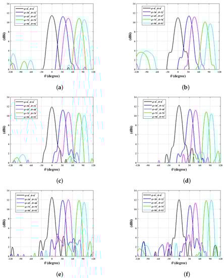 The simulated steering pattern as resulted with the defined seven circular rings for 10 GHz, 11 GHz, 12 GHz, 13 GHz, 14 GHz and 15 GHz are shown in Figure 5a–f for various angles of rotation of the WR-75 waveguide. This figure shows the drop in value of the peak main beam from 11.9 dB, 11.2 dB, 10.8 dB, 10.6 dB and 10.1 dB for , , , and angles of rotation of the waveguide, respectively, in the 12 GHz design frequency. This might be due to the increase in side lobe label of −11.2 dB, −8.4 dB, −8.1 dB, −9.2 dB and −8.3 dB for WR-75 waveguide angle of rotation of , , , and , respectively. As observed, the main beam deviated to the average elevation angle () value of , , , and for counter clockwise rotation angles () for WR-75 of , , , and , respectively.