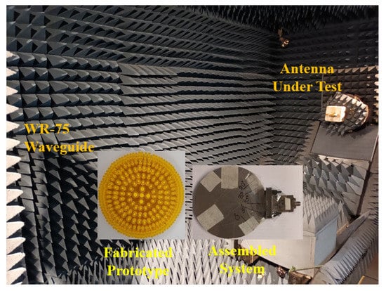 Waveguide WR-75 is used as a feed source with iris effect that shows matching behavior within the frequency band of operation from 10 GHz to 15 GHz. The extra metal plate is designed with the internal dimension of 15 mm × 7.5 mm that is kept at the mouth of the waveguide. The angular rotation of , , , and are maintained with anticlockwise rotation that shows the beam steering characteristics as described in further sections. We have considered the simulation mesh as cells per wavelength values to maintain the simulation resolution. The Model and Background are set to four and cells per maximum model box edge have a Model of 10 and Background of 1, which shows that the numerical convergence has been reached for the obtained simulation results. Similarly, the waveguide port boundary condition is considered to obtain the simulated values.