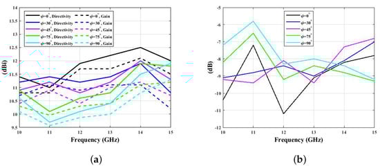 The simulated pattern of peak directivity and gain plots as well as the side lobe level variation after the placement of cylindrical rods in defined circular ring regions are shown in Figure 9a,b, respectively. As noticed, in the design operation frequency of 12 GHz, simulated peak directivity and gain values are 11.9, 11.2, 10.8, 10.6, 10.1 dBi and 11.7, 10.9, 10.4, 10.3, 9.87 dBi, respectively for , , , and of WR-75 waveguide counter clockwise direction, which shows the decreasing trend in its values. Similarly, side lobe levels are −11.2 dB, −8.4 dB, −8.1.6 dB, −9.2 dB and −8.3 dB for the rotation of the WR-75 waveguide in , , , and in the counter clockwise direction.