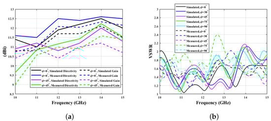 In addition, we have plotted the measured directivity and gain plots against the simulated values for , angles of rotation of WR-75 waveguide, which is shown in Figure 10a. This figure highlights the matching trends for simulated and measured directivity and gain patterns. The measured values of directivity and gain in condition at 11, 12 and 14 GHz are 11.5, 11.01 dBi; 12.5, 12.08 dBi; and 12.6, 12.33 dBi, respectively. Similarly measured directivity and gain values in condition at 11, 12 and 14 GHz are 10.84, 10.56 dBi; 11.16, 10.98 dBi; and 12.23, 11.59 dBi, respectively. Interestingly, these are comparable to the simulated values and are less than 3dB in difference between directivity and gain margin. This signifies the lower loss behavior of the material under consideration. Similarly, Figure 10b shows the simulated and measured return loss plot for rotation angles of , , , and for WR-75 waveguide. This plot signifies the matching of proposed antenna structure throughout the operating frequency band where its values are less than 2.2, expect for the measured case which might be due to the arrangement of cylinders within the defined circular regions of the proposed prototype.
