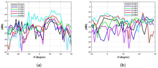 Moreover, we have analyzed the cross polarization values for both , angles of rotation of WR-75 waveguide, which are shown in Figure 11a,b. In the angles of rotation case, the observed cross polarization values are below −7 dBi where as in the case, its values are below -12 dBi. However, most of the values lie in between −15 dBi to −35 dBi, which signifies the better matching behavior in operating frequency ranging from 10 GHz to 15 GHz with respect to lower cross polarization with the minimum loss of signals at the receiver end.