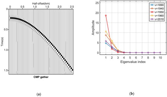A seismic event at time 0.24 s with a velocity . (a) CMP gather and (b) The corresponding principal components (eigenvalues) of the NMO-corrected CMP gathers with different scanning velocities.