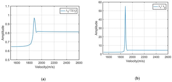 Principal component analysis is a common multivariate analysis method, and it has been widely used in data mining, pattern recognition, machine learning, and image compression [,,]. Principal component analysis regroups the original relevant indicators into a new set of unrelated comprehensive indicators. For the NMO-corrected seismic event, if the true scanning velocity is adopted, the NMO-corrected seismic event will be completely flattened, and the data matrix will have a strong spatial coherence. Thus, the first principal component has the absolute advantage compared with other components. If the wrong scanning velocity is adopted, the NMO-corrected seismic event is not flattened, then the first principal component of the data matrix is not overwhelming.