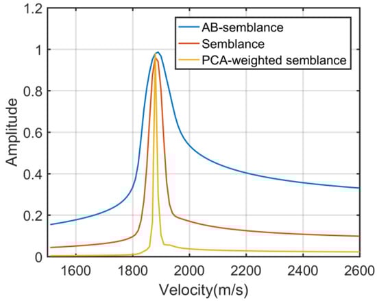 Here, we divide weights by their maximum value to normalize the new semblance from 0 to 1, which is convenient for the automatic velocity picking algorithm. The new semblance is a combination of the standard AB semblance and the weighting function. The AB semblance can handle with AVO anomalies, and the weighting function improves the resolution of AB semblance spectrum significantly. For example, Figure 3 shows the semblances of different methods at time 0.24 s in the above case. It can be seen that the proposed PCA-weighted semblance had a narrow pulse at scanning velocity , indicating that it had the highest resolution compared with other methods.
