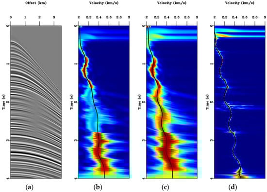 To analyze the performance of the new method in velocity analysis, we compared and analyzed the resolution of proposed semblance, conventional semblance, and AB semblance with a synthetic CMP gather. As shown in Figure 4a, we generated a CMP gather with the class-II AVO anomalies [] by the inverse normal moveout, where the AVO anomalies have the polarity reversal seismic amplitudes. We performed NMO corrections with a series of scanning velocities, and calculated the different semblance spectra on the NMO-corrected data. Then, we picked the velocity values corresponding to the peaks in semblance spectra. Figure 4b shows the conventional semblance of the synthetic CMP gather, in which the solid line represents the picked velocities. It can be seen that the energy clusters of conventional semblance were lost in the AVO regions (time 1.5 s to 3.0 s), resulting in inaccurate velocity picking. Figure 4c shows that the energy clusters of the AB semblance were restored in the AVO regions. However, the size of the energy cluster became larger, indicating a drop in resolution. Figure 4d shows that the resolution of our new method is significantly improved, which is of great benefit to avoiding the multiplicity of the auto-picking algorithm, and the energy clusters of new method are also strong in the AVO region.