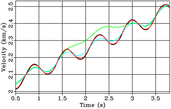 Picked velocity values from different semblances, where the black curve represents the true values of velocities, the green curve represents the picked velocities from the conventional semblance, the cyan curve represents the AB semblance, and the red curve represents our new method.