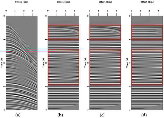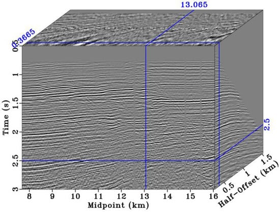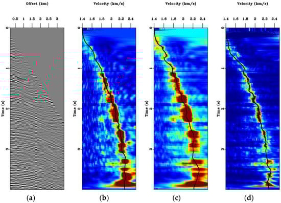 We used a field seismic data set to verify the effectiveness of the proposed method. Firstly, we used a 2-D real-world seismic gather (Figure 7a) to apply the velocity analysis, and the corresponding semblance spectra are shown in Figure 7b–d. It can be seen that the proposed method has a high sensitivity in velocity scanning (Figure 7d) and the energy clusters in our new semblance were easy to be picked out, thus reducing the uncertainty of velocity analysis. The experiment with the 2-D real-world seismic gather proved that the proposed method is effective in the field data processing.