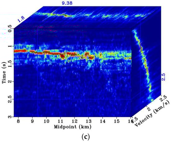 To further verify the performance of the new method, we use a historic 2D line from the Gulf of Mexico [] to analyze the resolution of different semblances. As shown in Figure 8, the real-world data had 250 CMP points. We obtained different semblances under the same scanning parameters. Figure 9. shows the obtained semblances displayed with a 3-D form, it can be seen that the conventional semblance lost some energies in the shallow layer (Figure 9a), but the corresponding energies were recovered in the AB semblance (Figure 9b). Unfortunately, the peak broadening of the AB semblance spectrum led to picking uncertainty. Figure 9c shows the result of our new method, it can be seen that the resolution of the new method was significantly improved, and the intensity of energy cluster was stronger than that of the conventional method.