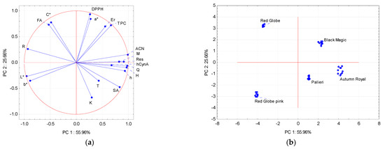 Projections of the variables (a) and scores (b) onto the factor plane defined by principal components (PC1 and PC2). Note: SA—sinapic acid; FA—ferulic acid; hCynA—hydroxycinnamic acid; Res—resveratrol; Q—quercetin; T—taxifolin; M—myricetin; K—kaempferol; H—hesperidin; Er—eriodictyol; R—rutin; L*—lightness, a* and b*—color coordinates, C*—chroma, h—hue angle; TPC—total polyphenol content; ACN—total anthocyanin content; DPPH—antioxidant activity.