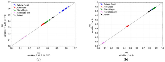 Figure 2 shows graphical interpretation of the AM results. From the charts, it could be observed that dark-colored grapes were assessed very high when taking the ranking based on phenolic content (Figure 2a), as well as ranking based on color coordinates (Figure 2b), whereas pink variety got the lowest rating (AM values) in both rankings. However, the differences between AM values were higher for color-based ranking than for phenolic content-based ranking (Table 4).
