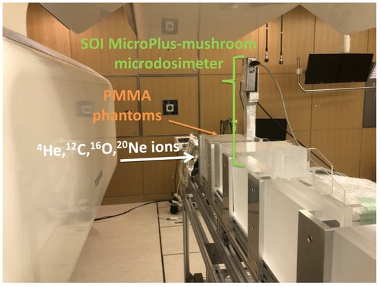 Photo of the experimental set-up with the SOI MicroPlus-mushroom microdosimeter positioned vertically behind PMMA phantoms in the horizontal scanning-beam port at NIRS-HIMAC.