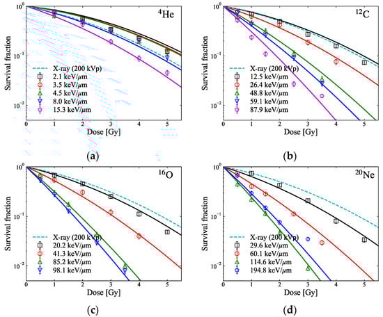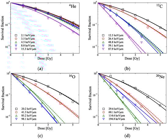 Markers show reported in vitro SF of HSGc-C5 cells for different LETs of pristine (a) 4He-, (b) 12C-, (c) 16O-, and (d) 20Ne-ion beams []. The lines represent the fitted survival curves based on the LQ model (solid lines: curves fitted with α and β set as free parameters; broken lines: curves fitted with α set as a free parameter and the constant β = 0.0474 Gy−2).