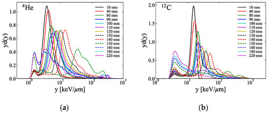 Figure 3a–d show the measured microdosimetric spectra across the SOBP of the ion beams at various depths in PMMA phantoms. Figure 4 shows the measured dose and the calculated  and y* from the microdosimetric spectra along the SOBP of the ion beams measured in Figure 3.