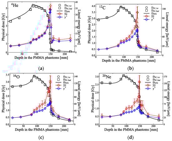 Physical dose, , measured using the IC, and  and y* calculated based on the microdosimetric lineal energy spectra displayed in Figure 3 at several depth levels in the PMMA phantoms along the SOBP of the (a) 4He-, (b) 12C-, (c) 16O-, and (d) 20Ne-ion beams. The physical dose was measured twice . The black solid lines are the physical doses planned by the TPS. Each error bar corresponds to the uncertainties of the linear energies evaluated using error propagation from the measured spectrum.